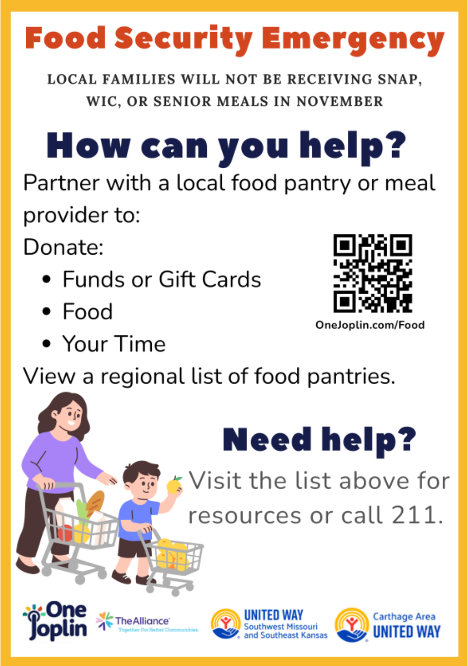 • Check out an up-to-date local resource directory, which includes food pantry locations, available online at https://www.onejoplin.com/food.