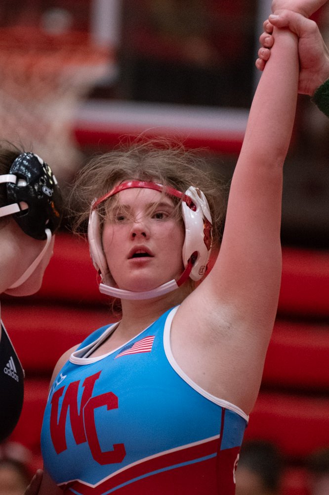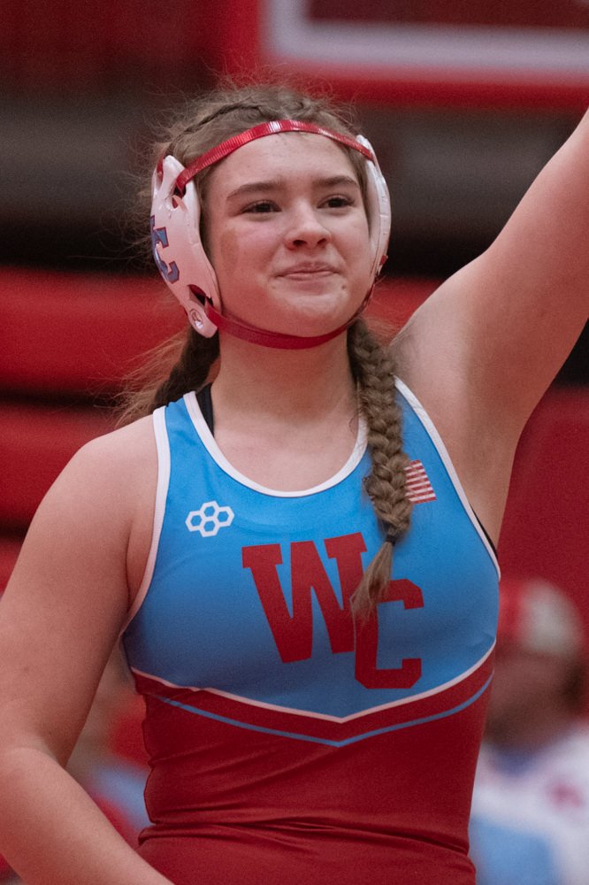 The Webb City girls’ first match was a 45-36 win against Nevada. Lexie Smith (105) started the team’s scoring with a pin. Ivy Nobis (120) followed with a sudden victory in overtime.
