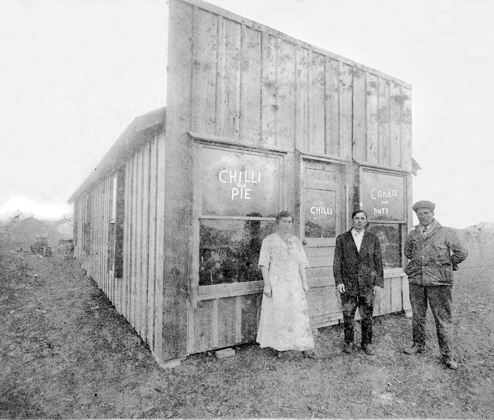 The circa 1900 photo of a simple chili parlor was marked “photo from the Webb City mining camp area.” Evidently, the purpose of the business was to offer a quick and inexpensive meal to the local miners. The three people are unidentified, as is the exact location of the building. The restaurant’s windows advertise only “Chilli and Pie” and “Candies and Nuts.” Photo courtesy of Kathy Sidenstricker.