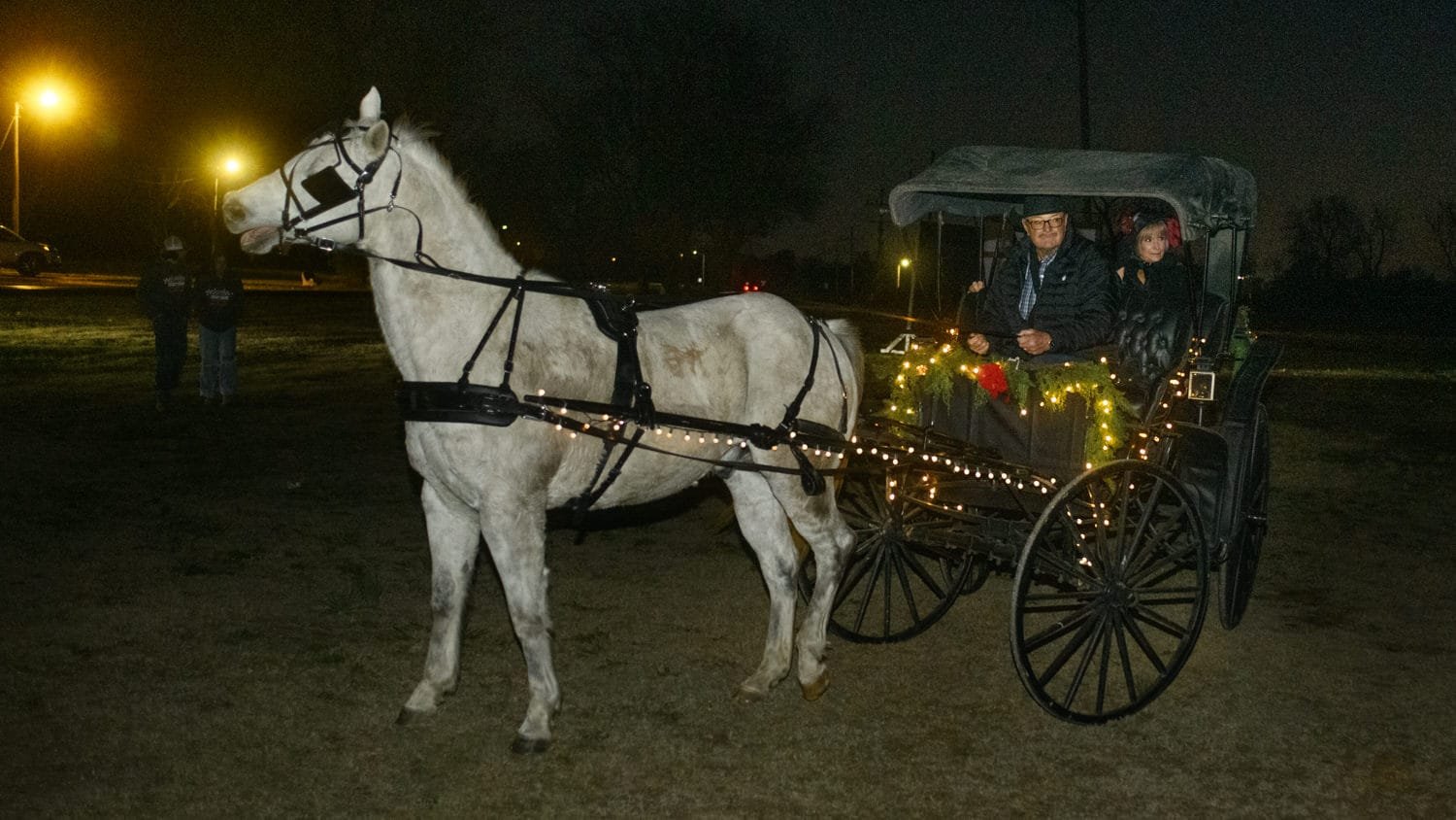 Fitting with this year’s Classic Christmas theme, Mayor Lynn Ragsdale and his wife, Betsy, were dressed in period attire as they arrived at the ceremony in a horse-drawn buggy.