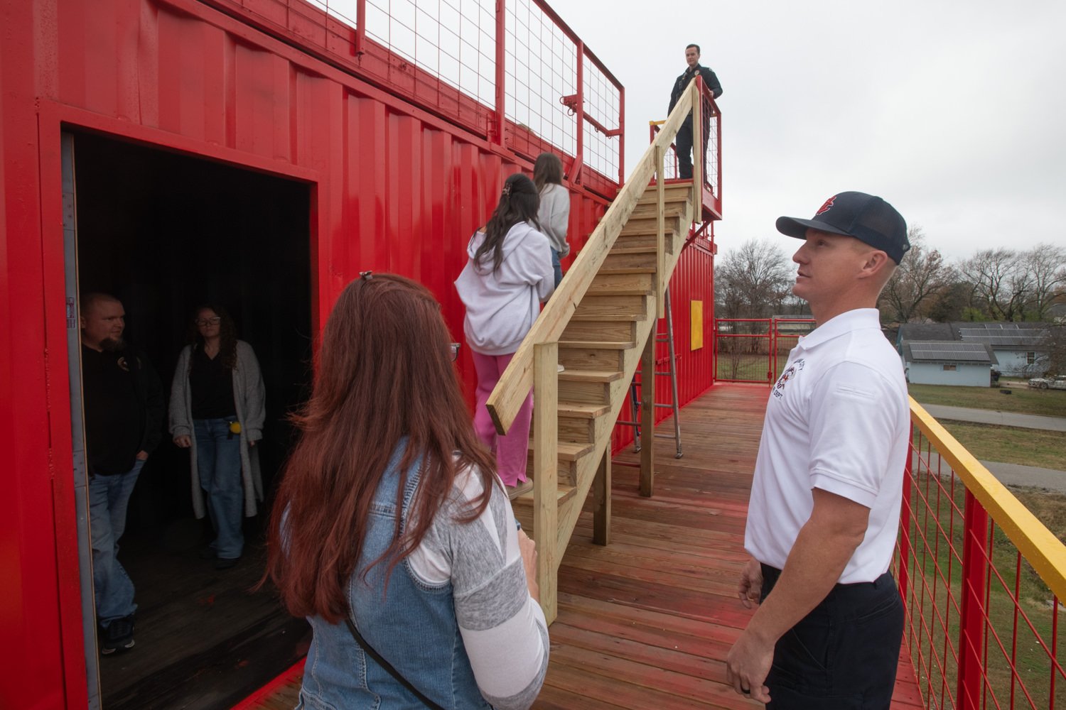 Battalion chief Cody Stone guides a tour to the balcony and roof of the training center.