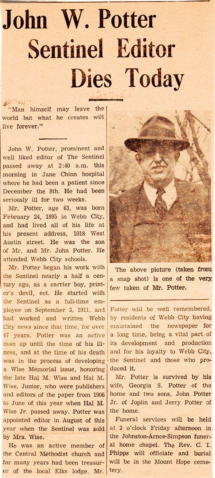 John W. Potter’s obituary is from the Dec. 17, 1958, issue of the Webb City Sentinel.