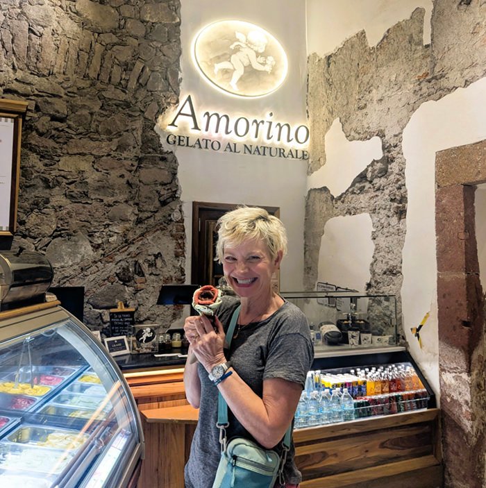 Tiny slivers of gelato were scooped out in petal shapes and put in that cone, one by one, going around in a circle until the whole thing looked like a rose. It was too beautiful to eat. I had them take a picture of me with the cone first. But I had to eat it eventually because the petals were hanging over the edges of the cone like the fully opened rose it resembled, and it would not be an exaggeration to say it was the best ice-cream cone I have ever had.