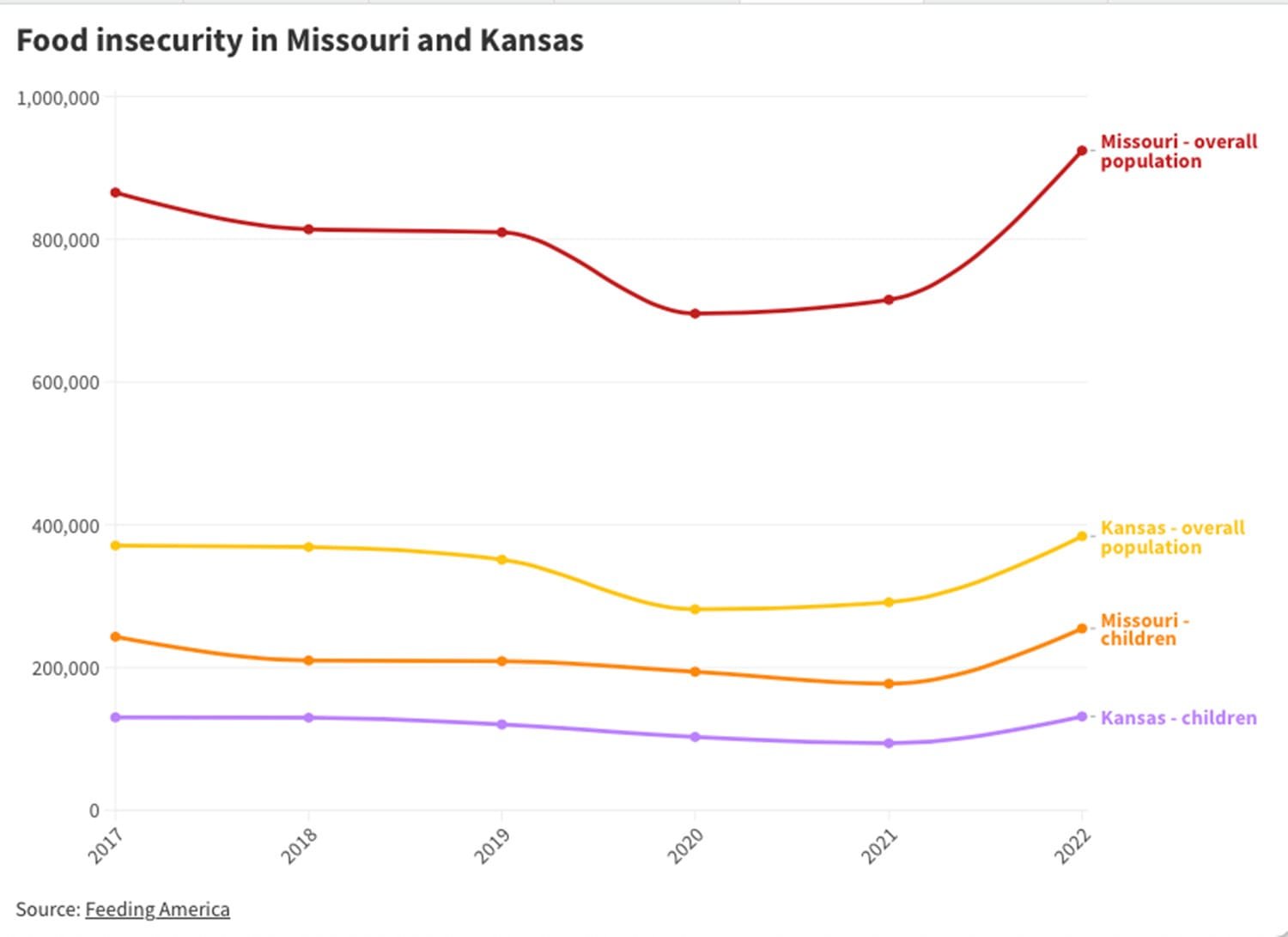 Feeding America estimates that 13% of Kansans faced food insecurity in 2022, compared with just under 10% in 2021. That included about 131,430 children or 19%, up from 94,000 or about 13% in 2021.