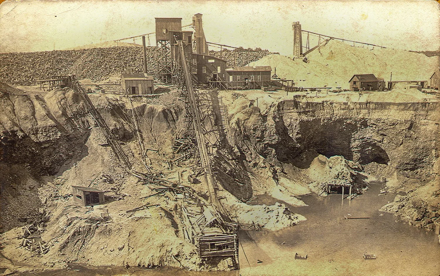 This accompanying photo, contributed by Jim Wisdom, shows the open pit mining operation. A large pile of rock to be processed can be seen on the left with the tailing pile on the right.