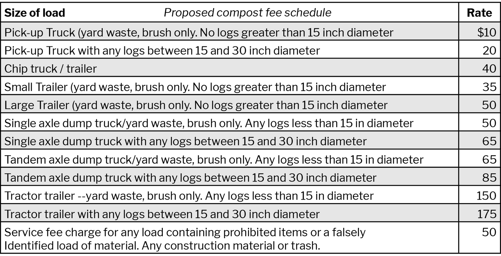 For the past couple years, the compost yard has been over stocked with limb grindings and mulch. We are working to renew some purchase agreements for the soil amendment but have not been successful. The yard continues to grow even after we implemented the “No Commercial Loads” allowed. The cost of repairs on the grinder and other equipment continue to rise along with our labor costs. Staff have looked at several options regarding how to move forward but still preserve a location which residents can dispose of their yard waste. This attached fee schedule is what staff has proposed for dumping limbs and yard waste at the plant and would apply to both residents and non-residents, Staff felt it would be difficult to enforce if otherwise. This would be accomplished with credit card transactions set up at the gate to the yard. No cash would be accepted.