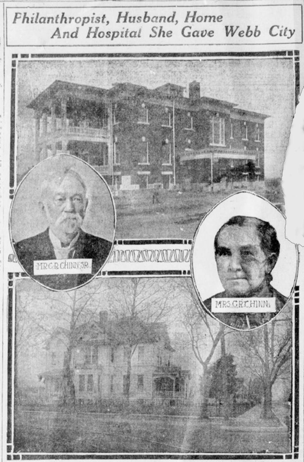 Mrs. Eliza Jane Chinn, founder of Jane Chinn Hospital, a pioneer resident of Webb City, died at the family home at Third street and Pennsylvania avenue at 3 o’clock yesterday morning. Death was from stomach trouble after an illness of eighteen months. Mrs. Jane Chinn was one of the wealthiest women of Jasper County and a prominent member of the Central Methodist Church South. Several years ago she spent $40,000 in establishing Jane Chinn Hospital, which was a gift to Webb City, with an endowment of $60,000. She was the largest contributor to the Central Methodist church building fund of $110,000. The Methodist Church of Prosperity was built and furnished by her at a cost of $3,000.