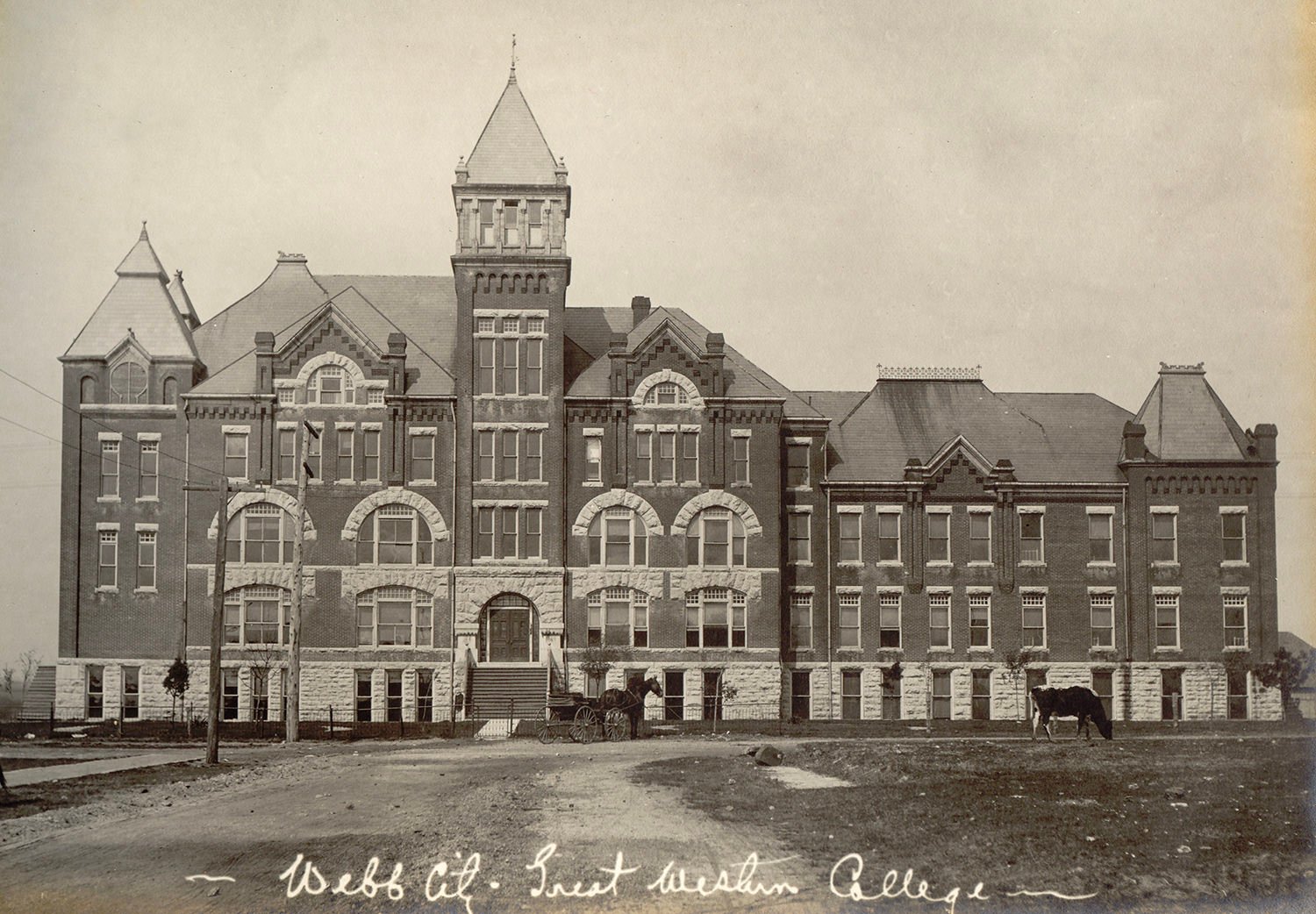 Note the cow grazing freely in front of the Great Western College, located on College Street at the west end of Austin Street. It was originally the Webb City Baptist College. Then in 1902 the Webb City College for Young Ladies. Only a year later, in 1903, It became the Great Western and Normal Business College. It ceased being a college when it was converted to apartments in 1909. It was eventually demolished, its bricks recycled by another building and its basement converted into the municipal swimming pool.