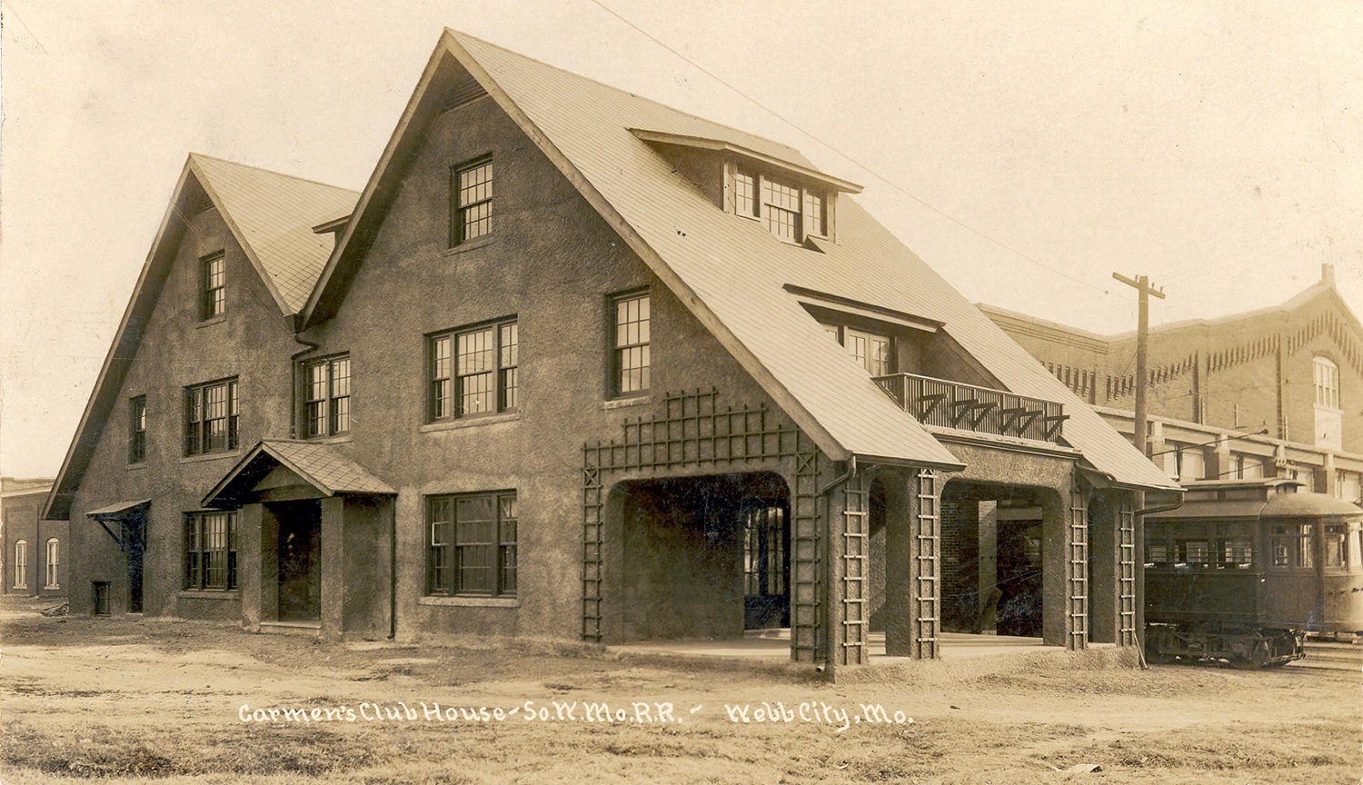 The clubhouse for the employees of the Southwest Missouri Electric Railway Co. was located in the West End. Behind it in this photo is the streetcar maintenance building. Across the street was the system's powerhouse (Skateland today).