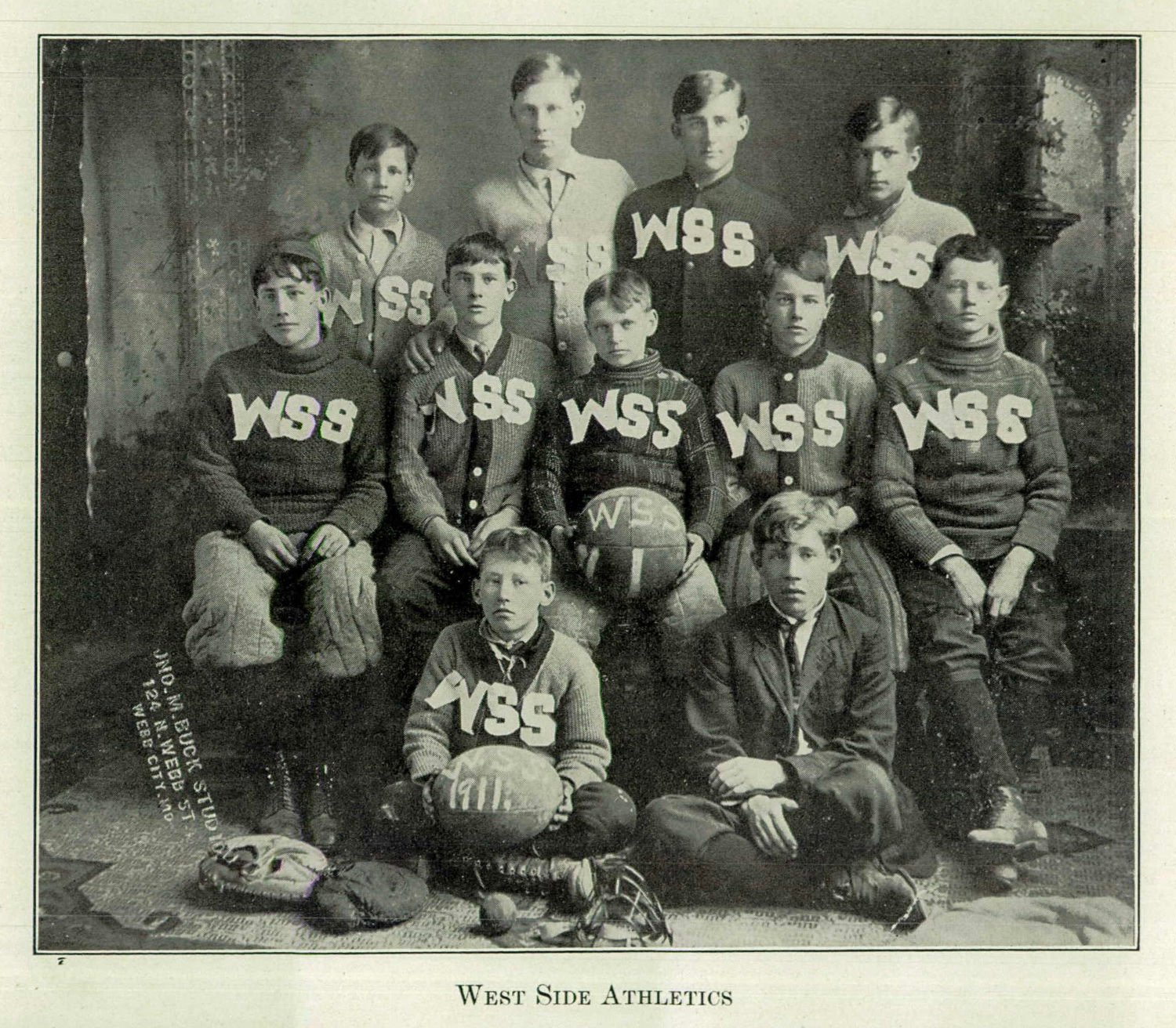 West Side School was located at the corner of Mineral and Cedar streets. This photograph, from the 1911 Webb City High School yearbook, shows a group of young men who played basketball for the West Side School. The WSS letters look like they were temporarily placed on the sweaters for the photograph.