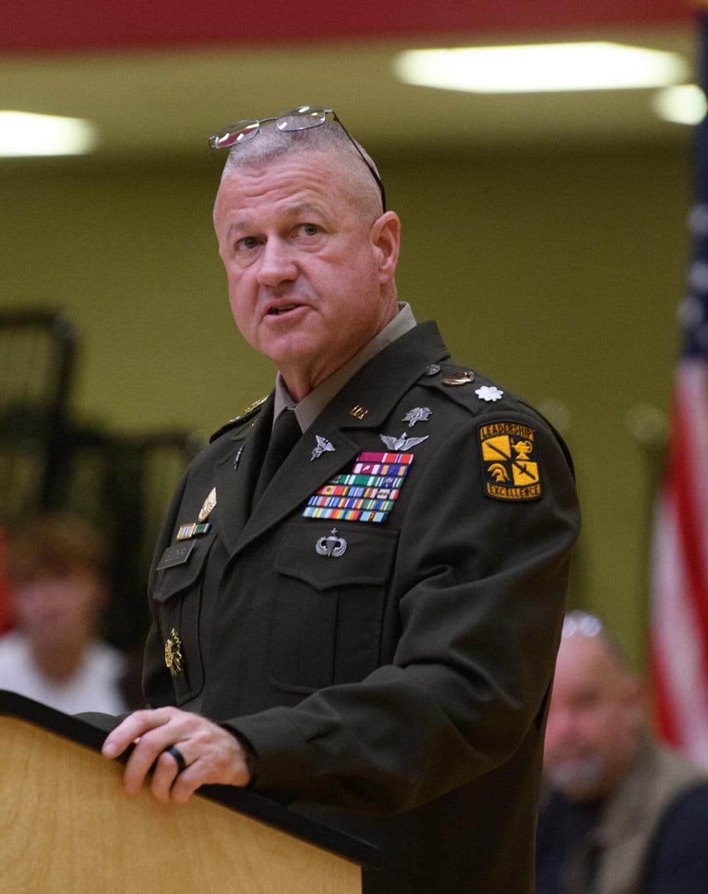 Guest speaker Lt. Col. Dustin Elder urged the students to reach out to veterans, listen to their stories and learn from them.