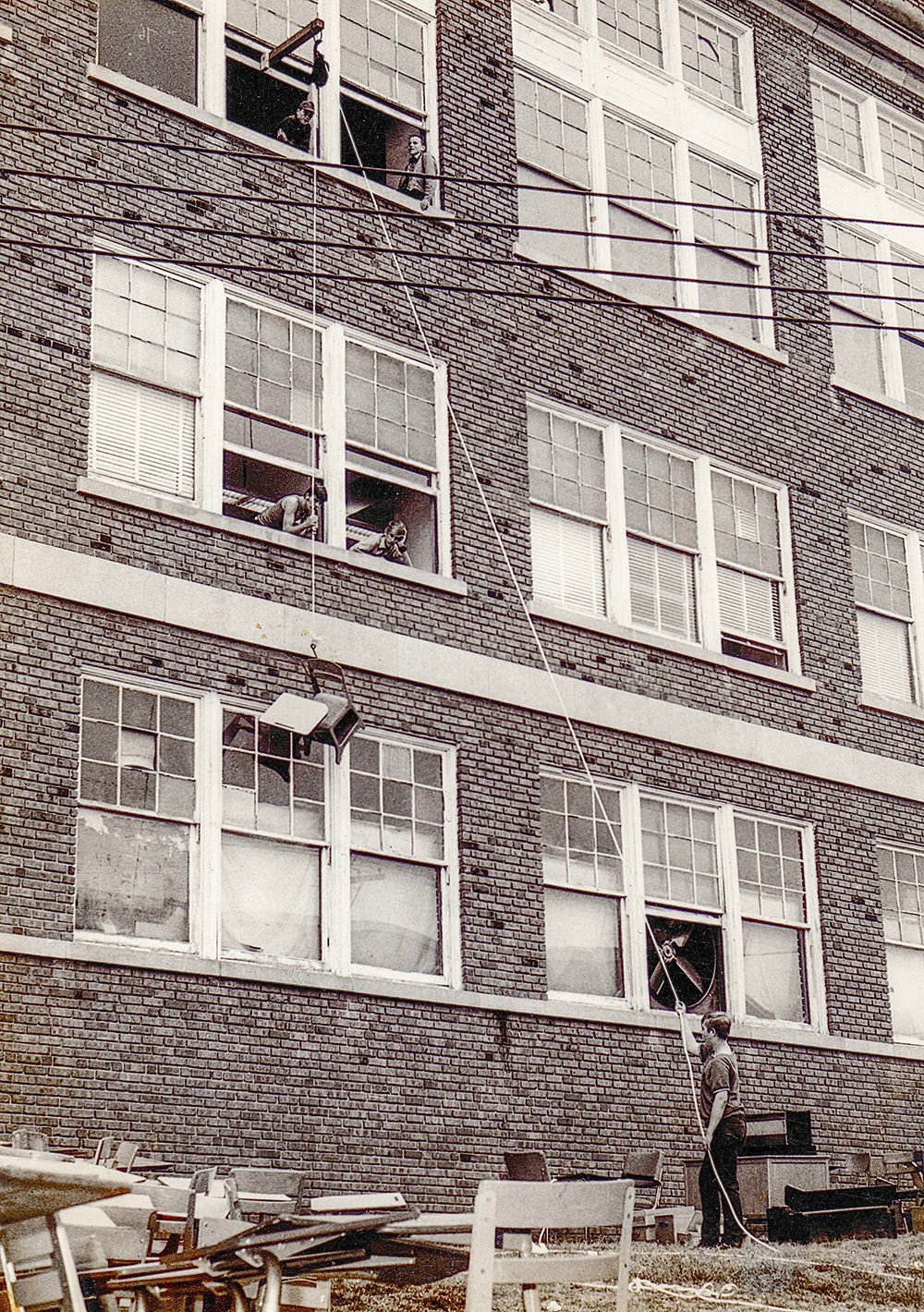 A pulley is used to lower desks from the upper stories.