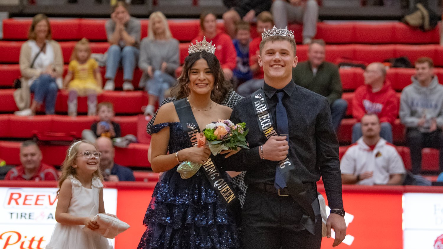 Aranza Gamez and Mason Williams are crowned Winter Homecoming Queen and King to the delight of flower girl Braylee Pickett.